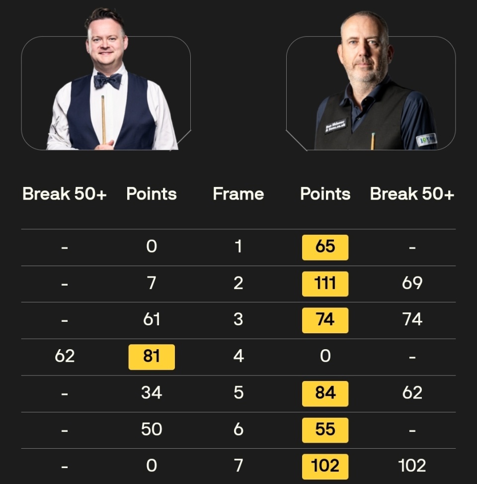 第三局,威廉姆斯单杆74分以74:61拿下此局3-0领先墨菲并扩大优势。第四局,墨菲单杆打出62分的表现以81:0扳回一城1-3落后威廉姆斯将分差缩小到了两局。第五局,威廉姆斯单杆打出62分的表现以84:34再胜一局4-1领先墨菲再次将分差扩大到了三局。